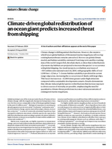 Womersley, Freya C., Sousa, Lara L., Humphries, Nicolas E., dos Santos Abrantes, Katya, Araujo, Gonzalo, Bach, Steffen S., Barnett, Adam, Berumen, Michael L., Lion, Sandra Bessudo, Braun, Camrin D., Clingham, Elizabeth, Cochran, Jesse E.M., de la Parra, Rafael, Diamant, Stella, Dove, Alistair D.M., Duarte, Carlos M., Dudgeon, Christine L., Erdmann, Mark V., Espinoza, Eduardo, Ferreira, Luciana C., Fitzpatrick, Richard, Cano, Jaime González, Green, Jonathan R., Guzman, Hector M., Hardenstine, Royale, Hasan, Abdi, Hazin, Fábio H.V., Hearn, Alex R., Hueter, Robert E., Jaidah, Mohammed Y., Labaja, Jessica, Ladino, Felipe, Macena, Bruno C.L., Meekan, Mark G., Morris, John J., Norman, Bradley M., Peñaherrera-Palma, Cesar R., Pierce, Simon J., Quintero, Lina Maria, Ramírez-Macías, Dení, Reynolds, Samantha D., Robinson, David P., Rohner, Christoph A., Rowat, David R.L., Sequeira, Ana M.M., Sheaves, Marcus, Shivji, Mahmood S., Sianipar, Abraham B., Skomal, Gregory B., Soler, German, Syakurachman, Ismail, Thorrold, Simon R., Thums, Michele, Tyminski, John P., Webb, D. Harry, Wetherbee, Bradley M., Queiroz, Nuno, and Sims, David W. (2024) Climate-driven global redistribution of an ocean giant predicts increased threat from shipping. Nature Climate Change, 14 (12). 8890. pp. 1282-1291.