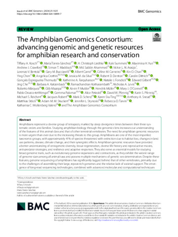 Kosch, Tiffany A., Torres-Sánchez, María, Liedtke, H. Christoph, Summers, Kyle, Yun, Maximina H., Crawford, Andrew J., Maddock, Simon T., Ahammed, Md Sabbir, Araújo, Victor L.N., Bertola, Lorenzo V., Bucciarelli, Gary M., Carné, Albert, Carneiro, Céline M., Chan, Kin O., Chen, Ying, Crottini, Angelica, da Silva, Jessica M., Denton, Robert D., Dittrich, Carolin, Espregueira Themudo, Gonçalo, Farquharson, Katherine A., Forsdick, Natalie J., Gilbert, Edward, Che, Jing, Katzenback, Barbara A., Kotharambath, Ramachandran, Levis, Nicholas A., Márquez, Roberto, Mazepa, Glib, Mulder, Kevin P., Müller, Hendrik, O’Connell, Mary J., Orozco-terWengel, Pablo, Palomar, Gemma, Petzold, Alice, Pfennig, David W., Pfennig, Karin S., Reichert, Michael S., Robert, Jacques, Scherz, Mark D., Siu-Ting, Karen, Snead, Anthony A., Stöck, Matthias, Stuckert, Adam M.M., Stynoski, Jennifer L., Tarvin, Rebecca D., Wollenberg Valero, Katharina C., and The Amphibian Genomics Consortium (2024) The Amphibian Genomics Consortium: advancing genomic and genetic resources for amphibian research and conservation. BMC Genomics, 25 (1). 1025.