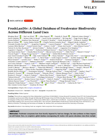Shen, Minghua, van Klink, Roel, Sagouis, Alban, Petsch, Danielle K., Abong'o, Deborah Atieno, Alahuhta, Janne, Al-Shami, Salman Abdo, Armendáriz, Laura Cecilia, Bae, Mi Jung, Begot, Tiago Octavio, Belliard, Jerome, Benstead, Jonathan Peter, Bomfim, Francieli F., Bredenhand, Emile, Budnick, William R., Callisto, Marcos, Calvão, Lenize Batista, Camacho-Rozo, Claudia Patricia, Cañedo-Argüelles, Miguel, Carvalho, Fernando Geraldo, Chapman, Jacqueline, Chapman, Lauren, Chen, Qiuwen, Chernoff, Barry, Cibils-Martina, Luciana, Closs, Gerard Patrick, Corbi, Juliano J., Cunha, Erlane José, Cunico, Almir Manoel, De los Rios-Escalante, Patricio, Dolédec, Sylvain, Dunck, Barbara, Edegbene, Augustine Ovie, Engman, Augustin C., Erős, Tibor, Esteves, Katharina Eichbaum, Faquim, Ruan Carlos Pires, Faria, Ana Paula Justino, Ferreira, Claudia Maris, Ferreira, Márcio Cunha, Fierro, Pablo, Freitas, Pâmela V., Fugère, Vincent, Garcia, Thiago Deruza, Giam, Xingli, Gonino, Gabriel Murilo Ribeiro, González-Trujillo, Juan David, Gubiani, Éder André, Hamada, Neusa, Haro, Roger John, Hepp, Luiz Ubiratan, Herrera-R, Guido A., Hill, Matthew J., Huda, A. Nurul, Iniguez-Armijos, Carlos, Jamoneau, Aurélien, Jonsson, Micael, Juen, Leandro, Kadye, Wilbert T., Kahirun, Kahirun, Kasangaki, Aventino, Larson, Chad A., Pereira, Alexandre Leandro, Leboucher, Thibault, Leite, Gustavo Figueiredo Marques, Li, Dunhai, Luiza-Andrade, Ana, Luke, Sarah H., Lundquist, Matthew Joseph, Lupi, Daniela, Machuca-Sepúlveda, Jorge, Macuiane, Messias Alfredo, Mancera-Rodriguez, Nestor Javier, Márquez, Javier A., Martins, Renato Tavares, Masese, Frank O., Meixler, Marcia S., Michelan, Thaisa Sala, Monge-Salazar, María José, Mruzek, Joseph L., Mugni, Hernan Diego, Ndagurwa, Hilton Garikai Taambuka, Niba, Augustine, Nimptsch, Jorge, Novelo-Gutiérrez, Rodolfo, Ochieng, Hannington, Pacheco-Díaz, Rodrigo, Park, Young Seuk, Passy, Sophia I., Pearson, Richard G., Peressin, Alexandre, Périco, Eduardo, Pires, Mateus Marques, Poulos, Helen, Principe, Romina E., Prudente, Bruno S., Ríos-Touma, Blanca, Ruaro, Renata, Schmitter-Soto, Juan J., Schneck, Fabiana, Schulz, Uwe Horst, Selvakumar, Chellappa, Sharma, Chhatra Mani, Siqueira, Tadeu, Solis, Marina Laura, Sousa, Raniere Garcez Costa, Stanley, Emily H., Stenger-Kovács, Csilla, Tales, Evelyne, Teresa, Fabrício Barreto, Thornhill, Ian, Tison-Rosebery, Juliette, Vieira, Thiago Bernardi, Villada-Bedoya, Sebastián, White, James C., Wood, Paul J., Xie, Zhicai, Yule, Catherine M., Zequi, João Antonio Cyrino, Chase, Jonathan M., UNSPECIFIED, and UNSPECIFIED (2024) FreshLanDiv: A Global Database of Freshwater Biodiversity Across Different Land Uses. Global Ecology and Biogeography, 33 (12). e13917.