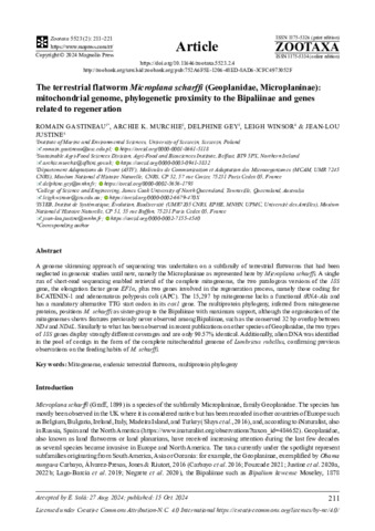 Gastineau, Romain, Murchie, Archie K., Gey, Delphine, Winsor, Leigh, and Jean-Lou, Justine (2024) The terrestrial flatworm Microplana scharffi (Geoplanidae, Microplaninae): mitochondrial genome, phylogenetic proximity to the Bipaliinae and genes related to regeneration. Zootaxa, 5523 (2). pp. 211-221.