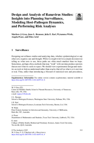 Gray, Matthew J., Brunner, Jesse L., Earl, Julia E., Wirth, Wytamma, Peace, Angela, and Ariel, Ellen (2024) Design and analysis of Ranavirus studies: Insights into planning surveillance, modeling host-pathogen dynamics, and performing risk analyses. In: Gray, Matthew J., and Chinchar, V. Gregory, (eds.) Ranaviruses: Emerging Pathogens of Ectothermic Vertebrates. Springer, Cham, Switzerland, pp. 313-371.