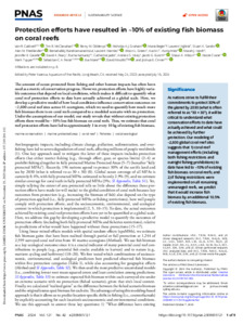 Caldwell, Iain, McClanahan, Tim R., Oddenyo, Remy M., Graham, Nicholas A.J., Beger, Maria, Vigliola, Laurent, Sandin, Stuart A., Friedlander, Alan M., Randriamanantsoa, Bemahafaly, Wantiez, Laurent, Green, Alison, Humphries, Austin T., Hardt, Marah, Caselle, Jennifer E., Feary, David A., Karkarey, Rucha, Jadot, Catherine, Hoey, Andrew S., Eurich, Jacob G., Wilson, Shaun K., Crane, Nicole, Tupper, Mark, Ferse, Sebastian C.A., Maire, Eva, Mouillot, David, and Cinner, Joshua E. (2024) Protection efforts have resulted in ~10% of existing fish biomass on coral reefs. Proceedings of the National Academy of Sciences of the United States of America, 121 (42). e2308605121.