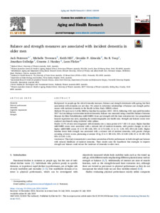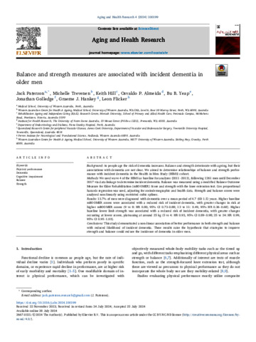 Paterson, Jack, Trevenen, Michelle, Hill, Keith, Almeida, Osvaldo P., Yeap, Bu B., Golledge, Jonathan, Hankey, Graeme, and Flicker, Leon (2024) Balance and strength measures are associated with incident dementia in older men. Aging and Health Research, 4 (3). 100199.