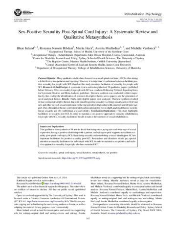 Ireland, Blaze, Pebdani, Roxanna Nasseri, Heck, Marita, Mudholkar, Asmita, and Verdonck, Michèle (2024) Sex-Positive Sexuality Post-Spinal Cord Injury: A Systematic Review and Qualitative Metasynthesis. Rehabilitation Psychology, 70 (2). pp. 182-193.
