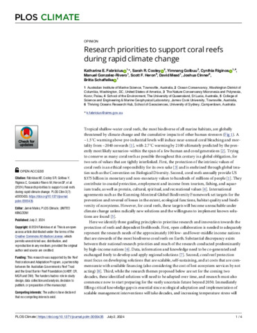Fabricius, Katharina E., Cooley, Sarah R., Golbuu, Yimnang, Riginos, Cynthia, Gonzalez-Rivero, Manuel, Heron, Scott F., Mead, David, Cinner, Joshua, and Schaffelke, Britta (2024) Research priorities to support coral reefs during rapid climate change. PLOS Climate, 3 (7). e0000435.