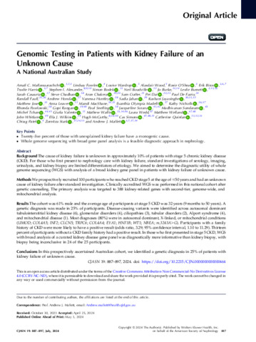 Mallawaarachchi, Amali C., Fowles, Lindsay, Wardrop, Louise, Wood, Alasdair, O'Shea, Rosie, Biros, Erik, Harris, Trudie, Alexander, Stephen I., Bodek, Simon, Boudville, Neil, Burke, Jo, Burnett, Leslie, Casauria, Sarah, Chadban, Steve, Chakera, Aron, Crafter, Sam, Dai, Pei, De Fazio, Paul, Faull, Randall, Honda, Andrew, Huntley, Vanessa, Jahan, Sadia, Jayasinghe, Kushani, Jose, Matthew, Leaver, Anna, MacShane, Mandi, Madelli, Evanthia Olympia, Nicholls, Kathy, Pawlowski, Rhonda, Rangan, Gopi, Snelling, Paul, Soraru, Jacqueline, Sundaram, Madhivanan, Tchan, Michel, Valente, Giulia, Wallis, Mathew, Wedd, Laura, Welland, Matthew, Whitlam, John, Wilkins, Ella J., McCarthy, Hugh, Simons, Cas, Quinlan, Catherine, Patel, Chirag, Stark, Zornitza, and Mallett, Andrew J. (2024) Genomic Testing in Patients with Kidney Failure of an Unknown Cause: A National Australian Study. Clinical Journal of the American Society of Nephrology, 19 (7). pp. 887-897.