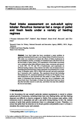 Giri, I. Nyoman Adiasmara, Sudewi, Selamet, Bejo, Irvin, Simon, Haryanti, and Jones, Clive (2024) Feed intake assessment on sub-adult spiny lobster Panulirus homarus fed a range of pellet and fresh feeds under a variety of feeding regimes. In: Bio Web of Conferences (112) 01008. From: EIS 2023: 6th EMBRIO International Symposium: Ocean for Prosperity: Sustainably Use of the Ocean Resources for Economic Growth, Improvement of Livelihoods, and Preserve its Ocean Ecosystem Health, 6-7 November 2023, Bogor, Indonesia.