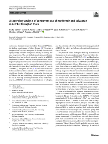 Stanley, I. Kitty, Palma, Anton M., Viecelli, Andrea K., Johnson, David W., Hawley, Carmel M., Staatz, Christine E., and Mallett, Andrew J. (2024) A secondary analysis of concurrent use of metformin and tolvaptan in ADPKD tolvaptan trials. Journal of Nephrology, 37 (5). pp. 1417-1419.