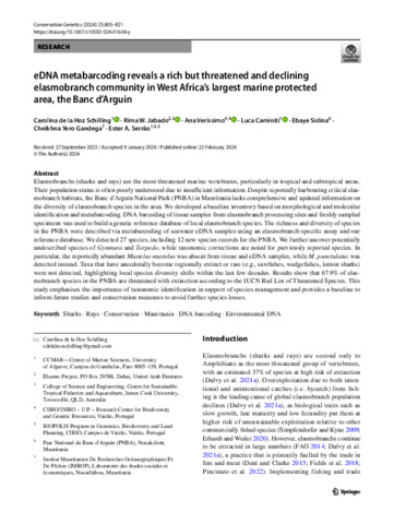 de la Hoz Schilling, Carolina, Jabado, Rima W., Veríssimo, Ana, Caminiti, Luca, Sidina, Ebaye, Gandega, Cheikhna Yero, and Serrao, Ester A. (2024) eDNA metabarcoding reveals a rich but threatened and declining elasmobranch community in West Africa’s largest marine protected area, the Banc d’Arguin. Conservation Genetics, 25 (3). pp. 805-821.