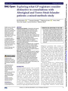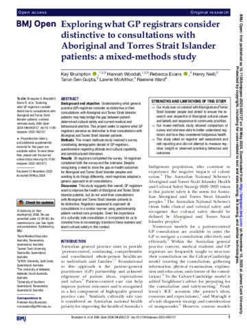 Brumpton, Kay, Woodall, Hannah, Evans, Rebecca, Neill, Henry, Sen Gupta, Tarun, McArthur, Lawrie, and Ward, Raelene (2024) Exploring what GP registrars consider distinctive to consultations with Aboriginal and Torres Strait Islander patients: A mixed-methods study. BMJ Open, 14 (5). e082137.