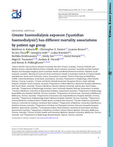Roberts, Matthew A., Davies, Christopher E., Brown, Leanne, Chua, Su Jen, Irish, Georgina, Kairaitis, Lukas, Krishnasamy, Rathika, See, Emily, Semple, David, Toussaint, Nigel D., Viecelli, Andrea K., and Polkinghorne, Kevan R. (2024) Greater haemodialysis exposure ('quotidian haemodialysis') has different mortality associations by patient age group. Clinical Kidney Journal, 17 (5). sfae103.