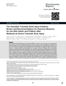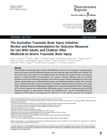 Ponsford, Jennie L., Hicks, Amelia J., Bagg, Matthew K., Phyland, Ruby, Carrier, Sarah, James, Amelia C., Lannin, Natasha A., Rushworth, Nick, O'Brien, Terence J., Cameron, Peter A., Cooper, D. Jamie, Hill, Regina, Gabbe, Belinda J., AUS-TBI Initiative Investigators, [Cullen, Jennifer], and [Ellis, Daniel Y.] (2024) The Australian Traumatic Brain Injury Initiative: Review and Recommendations for Outcome Measures for Use With Adults and Children After Moderate-to-Severe Traumatic Brain Injury. Neurotrauma Reports, 5 (1). pp. 387-408.