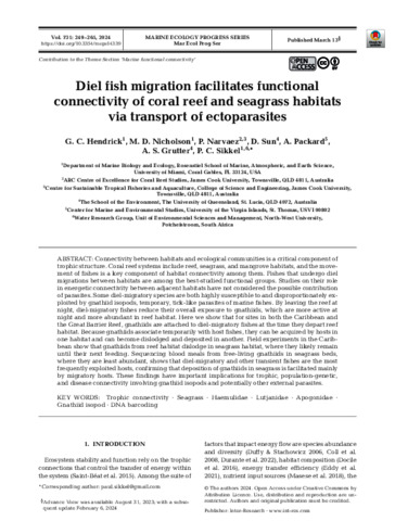 Hendrick, G.C., Nicholson, M.D., Narvaez, P., Sun, D., Packard, A., Grutter, A.S., and Sikkel, P.C. (2024) Diel fish migration facilitates functional connectivity of coral reef and seagrass habitats via transport of ectoparasites. Marine Ecology Progress Series, 731. pp. 249-265.