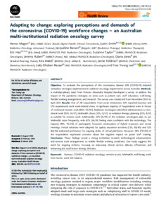Magon, Honor, Smith, Justin, Besson, Jacqueline, Hau, Eric, Taylor, Suzanne, Ruben, Jeremy, Jones, Diana, Mabb, Kira, Feldman, Jamie, Gholam Rezaei, Leily, and Lee, Yoo Young (2024) Adapting to change: exploring perceptions and demands of the coronavirus (COVID-19) workforce changes - an Australian multi-institutional radiation oncology survey. Australian Health Review, 48 (4). pp. 388-395.