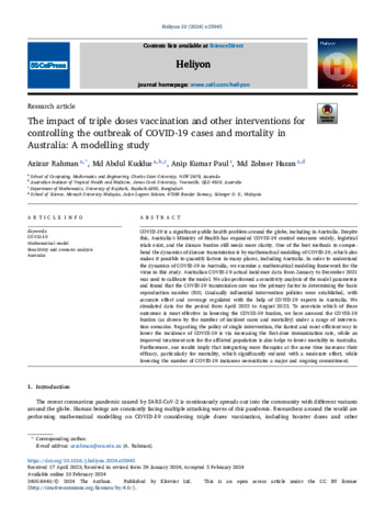 Rahman, Azizur, Kuddus, Md Abdul, Paul, Anip Kumar, and Hasan, Md Zobaer (2024) The impact of triple doses vaccination and other interventions for controlling the outbreak of COVID-19 cases and mortality in Australia: A modelling study. Heliyon, 10 (4). e25945.