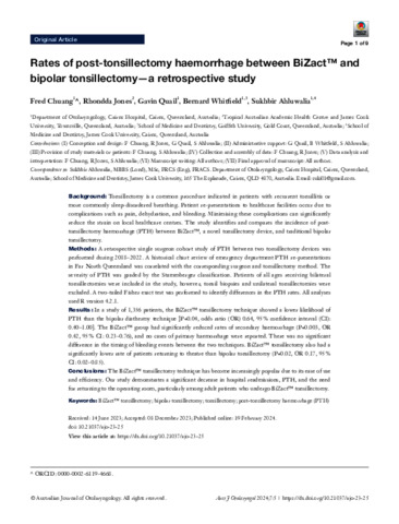 Chuang, Fred, Jones, Rhondda, Quail, Gavin, Whitfield, Bernard, and Ahluwalia, Sukhbir (2024) Rates of post-tonsillectomy haemorrhage between BiZact™ and bipolar tonsillectomy—a retrospective study. Australian Journal of Otolaryngology, 7 (5). 5.