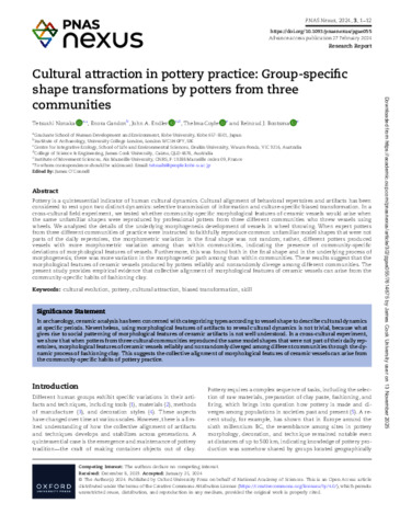 Nonaka, Tetsushi, Gandon, Enora, Endler, John A., Coyle, Thelma, and Bootsma, Reinoud J. (2024) Cultural attraction in pottery practice: Group-specific shape transformations by potters from three communities. PNAS Nexus, 3 (2).