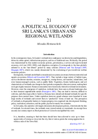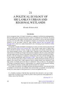 Wetlands are transient ecosystems, often used and inhabited by underprivileged communities. In Sri Lanka wetlands are frequently at the centre of social-environmental conflicts emerging from urbanisation and infrastructure expansion. Once treated as the shunned backyards of cities or treacherous landscapes in the regions, wetlands have turned into a hot commodity in the neo-liberal economy. They are seen as potential spaces for urban real estate, green urban showpieces, and a “path of least resistance” for linear infrastructure. Since colonial times, a vast extent of Sri Lankan wetlands have been converted into non-wetland uses or have been ecologically transformed by external environmental stressors. As a result, traditional users and inhabitants have been displaced and dispossessed, and disasters that can be related to wetland loss have increased. This chapter then explores the ecological trajectories of Sri Lanka's urban and regional wetlands, their political-economic drivers, and socio-environmental impacts, through a political ecology lens.