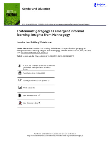 Larri, Larraine, and Whitehouse, Hilary (2024) Ecofeminist geragogy as emergent informal learning: insights from Nannagogy. Gender and Education, 36 (4). pp. 362-376.