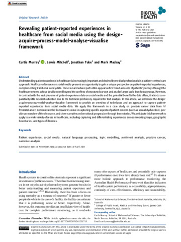 Murray, Curtis, Mitchell, Lewis, Tuke, Jonathan, and Mackay, Mark (2024) Revealing patient-reported experiences in healthcare from social media using the design-acquire-process-model-analyse-visualise framework. Digital Health, 10.