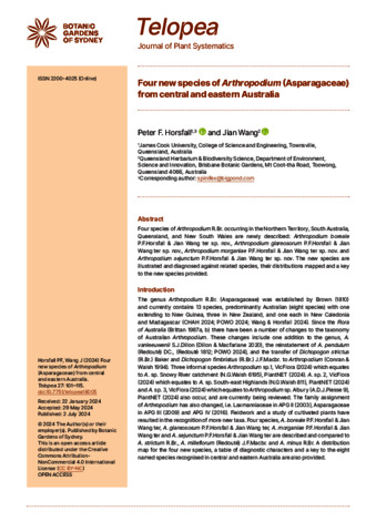 Horsfall, Peter F., and Wang, Jian (2024) Four new species of Arthropodium (Asparagaceae) from central and eastern Australia. Telopea, 27. pp. 101-115.