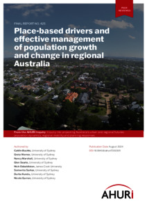 Buckle, Caitlin, Werner, Greta, Marshall, Nancy, Searle, Glen, Osbaldiston, Nick, Sarkar, Somwrita, Kundu, Durba, and Gurran, Nicole (2024) Place-based drivers and effective management of population growth and change in regional Australia. Report. Australian Housing and Urban Research Institute Limited Melbourne, Australia, Melbourne, Australia.