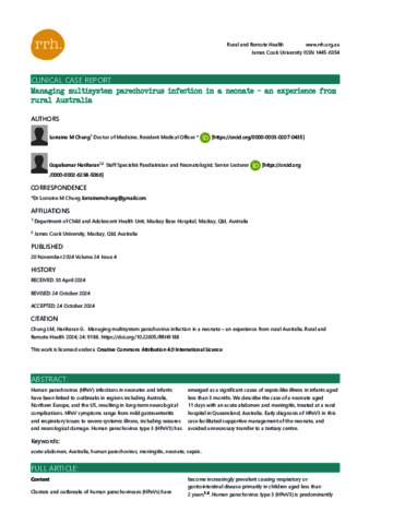 Chung, Lorraine M., and Hariharan, Gopakumar (2024) Managing multisystem parechovirus infection in a neonate – an experience from rural Australia. Rural and Remote Health, 24 (4). 9188.