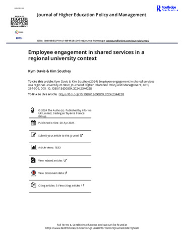 Davis, Kym, and Southey, Kim (2024) Employee engagement in shared services in a regional university context. Journal of Higher Education Policy and Management, 46 (3). pp. 291-306.