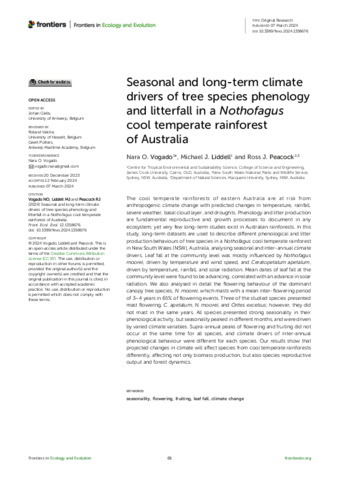 Vogado, Nara O., Liddell, Michael J., and Peacock, Ross J. (2024) Seasonal and long-term climate drivers of tree species phenology and litterfall in a Nothofagus cool temperate rainforest of Australia. Frontiers in Ecology and Evolution, 12. 1358676.