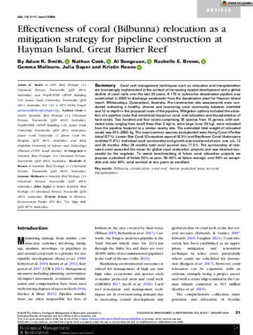 Smith, Adam K., Cook, Nathan, Songcuan, Al, Brown, Rachelle E., Molinaro, Gemma, Saper, Julia, and Keane, Kristin (2024) Effectiveness of coral (Bilbunna) relocation as a mitigation strategy for pipeline construction at Hayman Island, Great Barrier Reef. Ecological Management and Restoration, 25 (1). pp. 21-31.
