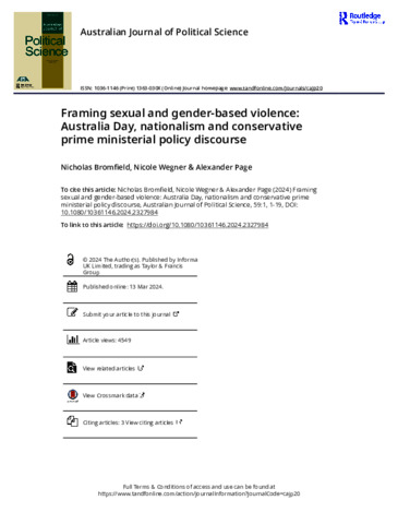 Bromfield, Nicholas, Wegner, Nicole, and Page, Alexander (2024) Framing sexual and gender-based violence: Australia Day, nationalism and conservative prime ministerial policy discourse. Australian Journal of Political Science, 59 (1). pp. 1-19.