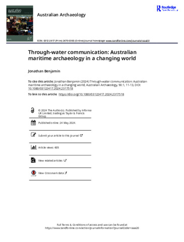Benjamin, Jonathan (2024) Through-water communication: Australian maritime archaeology in a changing world. Australian Archaeology, 90 (1). pp. 11-13.