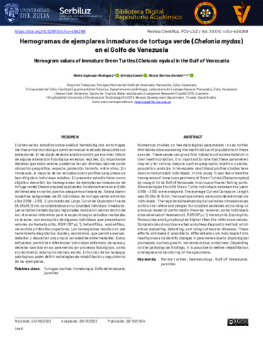 Espinoza–Rodríguez, Nínive, Conde, Brirelys, and Barrios–Garrido, Héctor (2024) Hemogram values of immature Green Turtles (Chelonia mydas) in the Gulf of Venezuela. Revista Cientifica De La Facultad De Veterinaria, 34 (1). e34269.