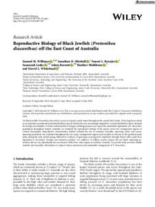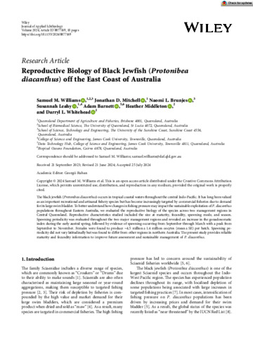 Williams, Samuel M., Mitchell, Jonathan D., Brunjes, Naomi L., Leahy, Susannah, Barnett, Adam, Middleton, Heather, and Whitehead, Darryl L. (2024) Reproductive Biology of Black Jewfish (Protonibea diacanthus) off the East Coast of Australia. Journal of Applied Ichthyology, 2024. 8877169.