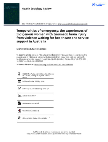 Fitts, Michelle, and Soldatic, Karen (2024) Temporalities of emergency: the experiences of Indigenous women with traumatic brain injury from violence waiting for healthcare and service support in Australia. Health Sociology Review, 33 (2). pp. 160-174.