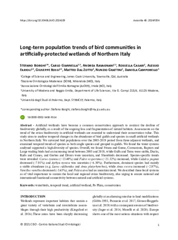Borghi, Stefano, Giannella, Carlo, Ravagnani, Andrea, Casari, Rossella, Farioli, Alessio, Rossi, Giuseppe, Dal Zotto, Matteo, Grattini, Nunzio, and Campobello, Daniela (2024) Long-term population trends of bird communities in artificially-protected wetlands of Northern Italy. Avocetta, 48. 2024F004.