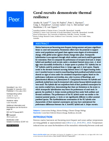 Lamb, Annika M., Peplow, Lesa M., Harrison, Peter L., Humphrey, Craig A., Latini, Lorenzo, McCutchan, Guy A., and van Oppen, Madeleine J.H. (2024) Coral recruits demonstrate thermal resilience. PeerJ, 12 (11). e18273.