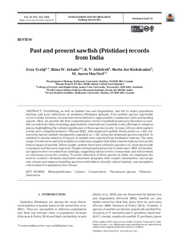 Tyabji, Zoya, Jabado, Rima W., Akhilesh, K.V., Kizhakudan, Shoba Joe, and MacNeil, M. Aaron (2024) Past and present sawfish (Pristidae) records from India. Endangered Species Research, 53. pp. 523-532.