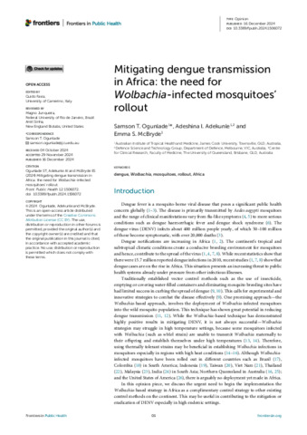 Ogunlade, Samson T., Adekunle, Adeshina I., and McBryde, Emma S. (2024) Mitigating dengue transmission in Africa: the need for Wolbachia-infected mosquitoes' rollout. Frontiers in Public Health, 12. 1506072.