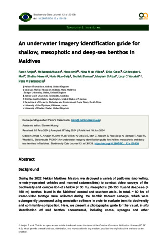Amjad, Farah, Ahusan, Mohamed, Amir, Hana, de Villiers, Nina M., Gress, Erika, Mah, Christopher L., Naeem, Shafiya, Rico-Seijo, Nuria, Samaai, Toufiek, Afzal, Maryiam S., Woodall, Lucy C., and Stefanoudis, Paris V. (2024) An underwater imagery identification guide for shallow, mesophotic and deep-sea benthos in Maldives. Biodiversity Data Journal, 12. e120128.