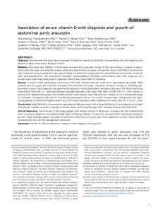 Thanigaimani, Shivshankar, Neale, Rachel E., Waterhouse, Mary, Moxon, Joseph V., Yeap, Bu B., Norman, Paul E., Flicker, Leon, Hankey, Graeme, Jenkins, Jason, Quigley, Frank, Clarke, Michael W., and Golledge, Jonathan (2024) Association of serum vitamin D with diagnosis and growth of abdominal aortic aneurysm. JVS: Vascular Science, 5. 100208.