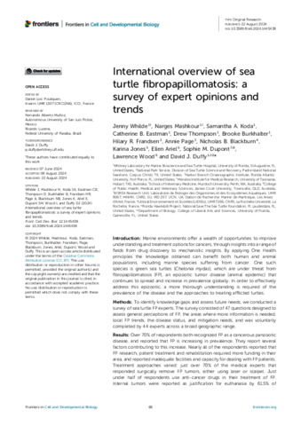 Whilde, Jenny, Mashkour, Narges, Koda, Samantha A., Eastman, Catherine B., Thompson, Drew, Burkhalter, Brooke, Frandsen, Hilary, Page, Annie, Blackburn, Nicholas B., Jones, Karina, Ariel, Ellen, Dupont, Sophie N., Wood, Lawrence, and Duffy, David J. (2024) International overview of sea turtle fibropapillomatosis: a survey of expert opinions and trends. Frontiers in Cell and Developmental Biology, 12. 1445438.
