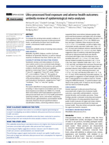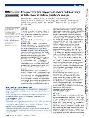 Lane, Melissa M., Gamage, Elizabeth, Du, Shutong, Ashtree, Deborah N., McGuinness, Amelia J., Gauci, Sarah, Baker, Phillip, Lawrence, Mark, Rebholz, Casey M., Srour, Bernard, Touvier, Mathilde, Jacka, Felice N., O'Neil, Adrienne, Segasby, Toby, and Marx, Wolfgang (2024) Ultra-processed food exposure and adverse health outcomes: Umbrella review of epidemiological meta-analyses. British Medical Journal, 384. e077310.