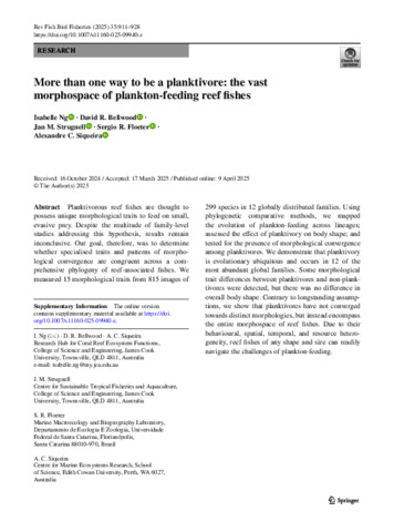 Ng, Isabelle, Bellwood, David R., Strugnell, Jan M., Floeter, Sergio R., and Siqueira, Alexandre C. (2025) More than one way to be a planktivore: the vast morphospace of plankton-feeding reef fishes. Reviews in Fish Biology and Fisheries, 35 (2). pp. 911-928.