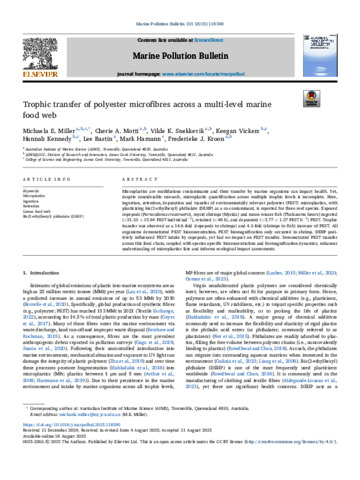 Miller, Michaela E., Motti, Cherie A., Snekkevik, Vilde K., Vickers, Keegan, Kennedy, Hannah, Bastin, Lee, Hamann, Mark, and Kroon, Frederieke (2025) Trophic transfer of polyester microfibres across a multi-level marine food web. Marine Pollution Bulletin, 221. 118590.