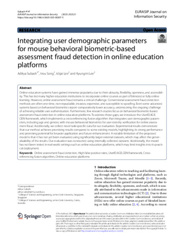 Subash, Aditya, Song, Insu, Lee, Ickjai, and Lee, Kyungmi (2025) Integrating user demographic parameters for mouse behavioral biometric-based assessment fraud detection in online education platforms. Eurasip Journal on Information Security, 2025. 21.