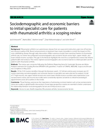 Ainsworth, Jack, Bolic, Marita, Ismail, Ibrahim, Mohammadpour, Zinat, and Wood, John (2025) Sociodemographic and economic barriers to initial specialist care for patients with rheumatoid arthritis: a scoping review. BMC Rheumatology, 9 (1). 76.