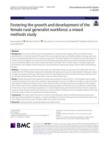 Anderson, Emily, O’Sullivan, Belinda, Gurney, Tiana, Young, Louise, Broadfield, Kirstie, Mcgrail, Matthew, and McArthur, Lawrie (2025) Fostering the growth and development of the female rural generalist workforce: a mixed methods study. International Journal for Equity in Health, 24 (1). 182.