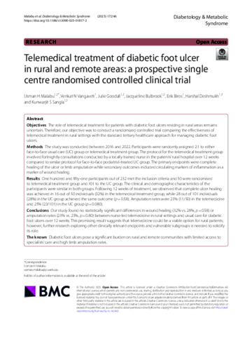 Malabu, Usman H., Vangaveti, Venkat N., Goodall, Julie-Anne, Bulbrook, Jacqueline, Biros, Erik, Deshmukh, Harshal, and Sangla, Kunwarjit S. (2025) Telemedical treatment of diabetic foot ulcer in rural and remote areas: a prospective single centre randomised controlled clinical trial. Diabetology & Metabolic Syndrome, 17 (1). 246.