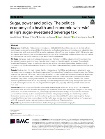 Elliott, Lana M., Waqa, Gade D., Ravuvu, Amerita L.A., Dalglish, Sarah L., and Topp, Stephanie M. (2025) Sugar, power and policy: The political economy of a health and economic ‘win–win’ in Fiji’s sugar-sweetened beverage tax. Globalization and Health, 21 (1). 43.